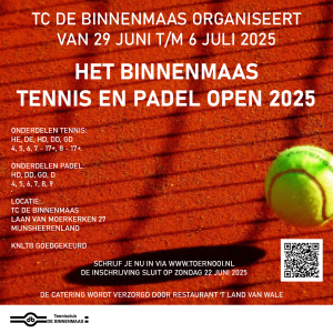 We zoeken per direct nog tennisteams om het Binnenmaas Tennis en Padel Open mee aan te vullen: HE4 (1x), HD5 (2x), GD5 (2x), DD6 (1x), GD6 (1x), HE7 (1x), DE7 (2x), GD7 (2x).
